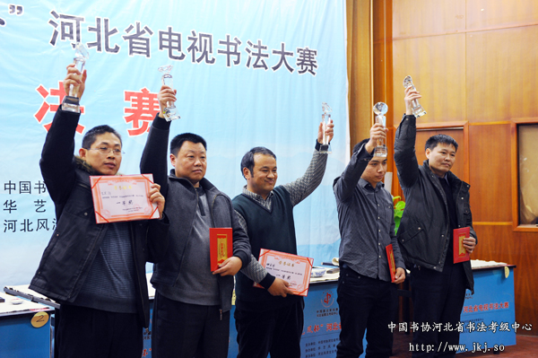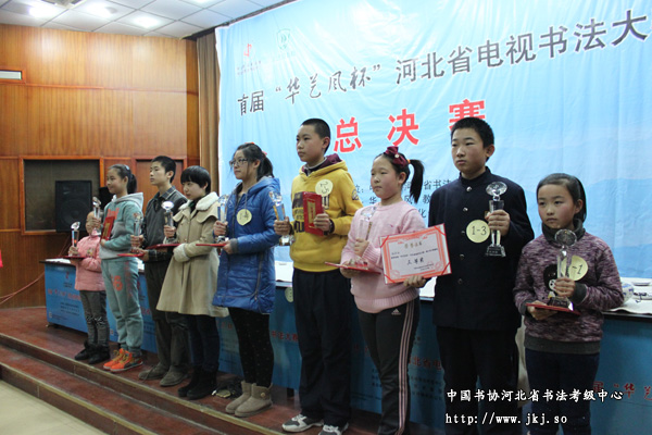 比赛结束,大赛组委会进行颁奖仪式,本次大赛评委会主任、首都师范大学书法教授、北京文史馆馆员卜希旸,大赛评委会副主任、原河北省书协副主席、著名书法篆刻家杜锡瑞,河北省教育厅副厅长诗人张益禄,原省委副秘书长、省文化促进会会长张国钧,省书协副主席任桂子,原煤炭部书协主席梁庚宸,国土学会书画院副院长王殿奎,大赛组委会主任、中国书协河北省书法考级中心主任曹晓林,石家庄电视台台长兰国良,华艺风教育集团总裁苏晓昆等为获奖选手颁发了奖杯和奖金。