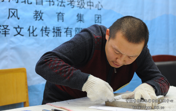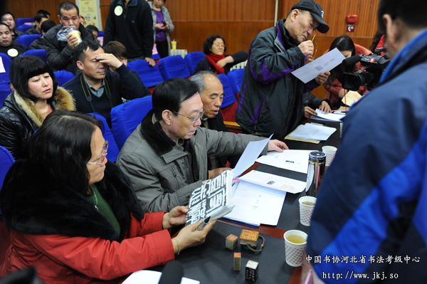 华艺风杯电视书法大赛评委为篆刻组参赛选手作品现场评比打分