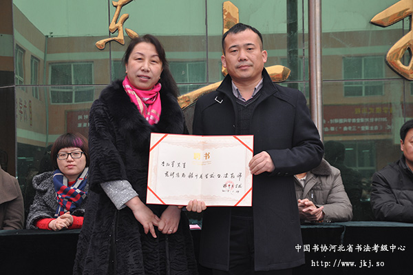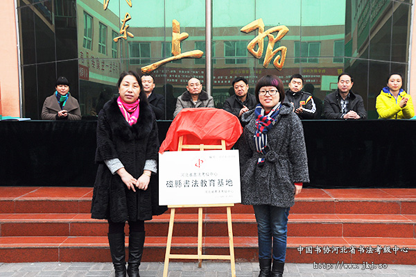 中国书协河北省书法考级中心秘书长冯欢为粮斗庄学校揭牌,成立了中国书协河北省书法考级中心磁县书法教育基地。
