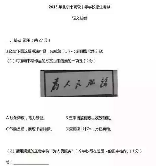 以下是 2015年北京中考语文试卷,第一道题就是书法题,而书法题和卷面分占总分30%了