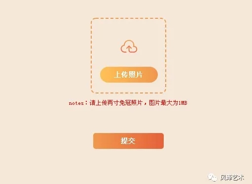 六、上传不大于 1MB 蓝底或红底的 2 寸免冠证件照片,提交。(上传照片用于考级证书上,请勿上传翻拍照片或者生活照)