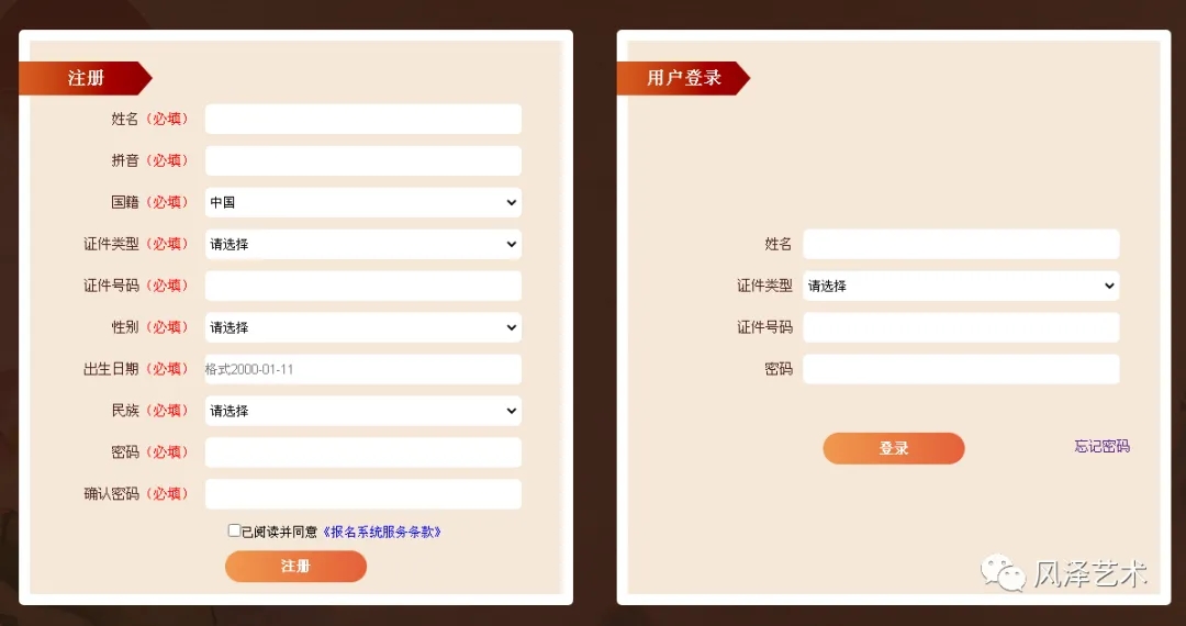 二、进入后,左侧为注册界面,右侧为用户登录界面。考生应实名注册,真实准确填写个人信息(一个有效证件只能注册一次);注册成功后,下次进入该界面可直接点击登录。